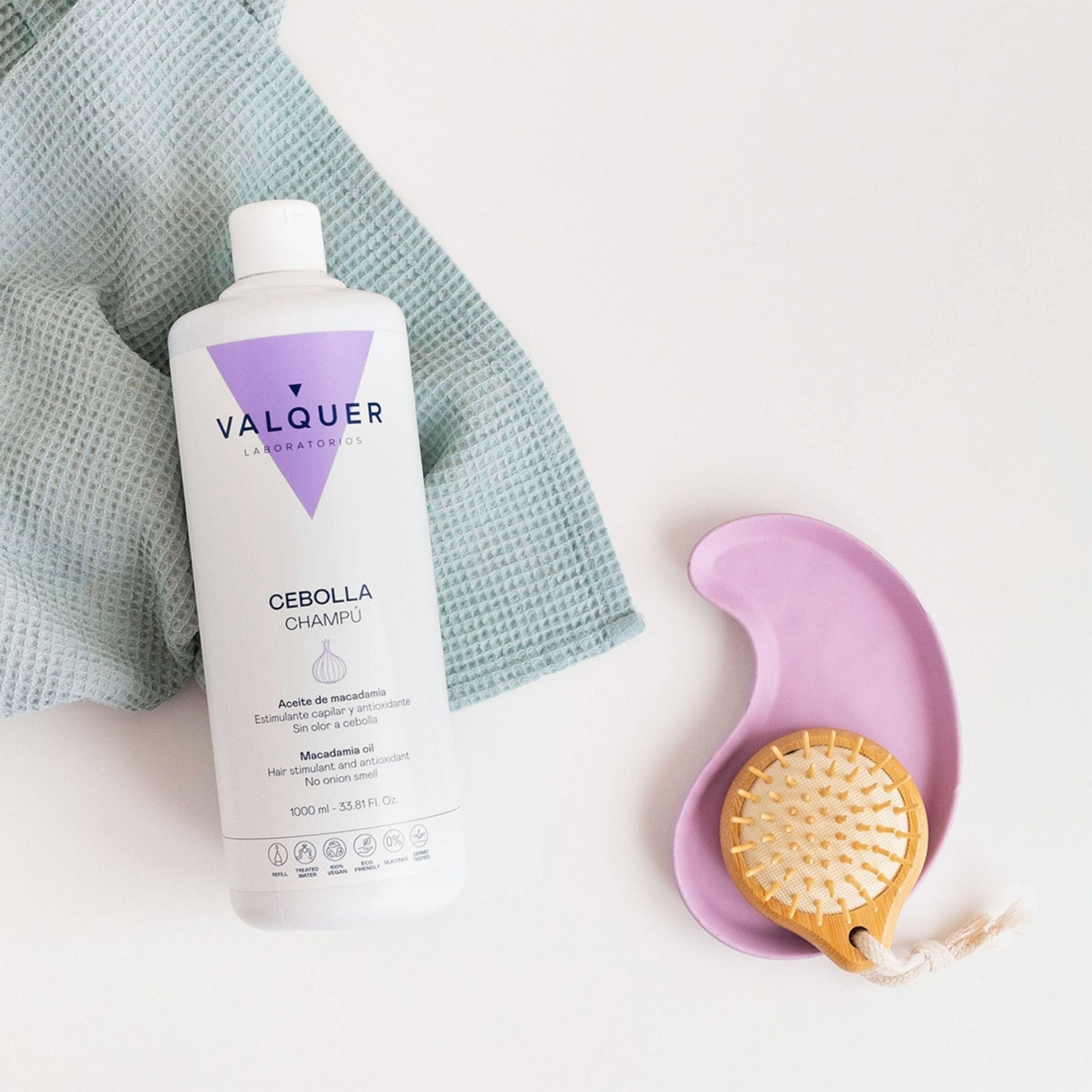 Champú vegano con extracto de cebolla, revitalizante, antioxidante y purificante desarrollado por Valquer®. Fórmula natural que estimula el cuero cabelludo, fortalece el cabello y aporta vitalidad.
