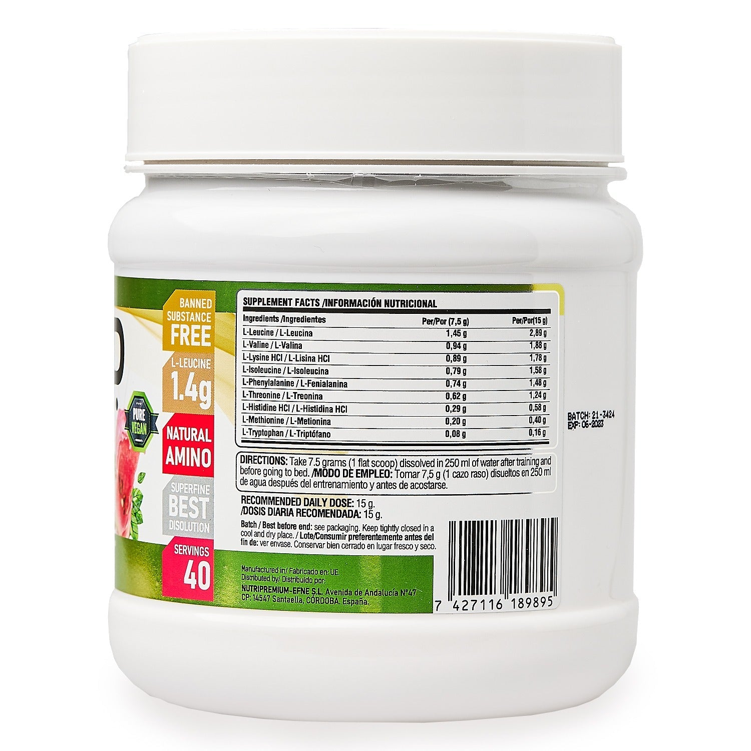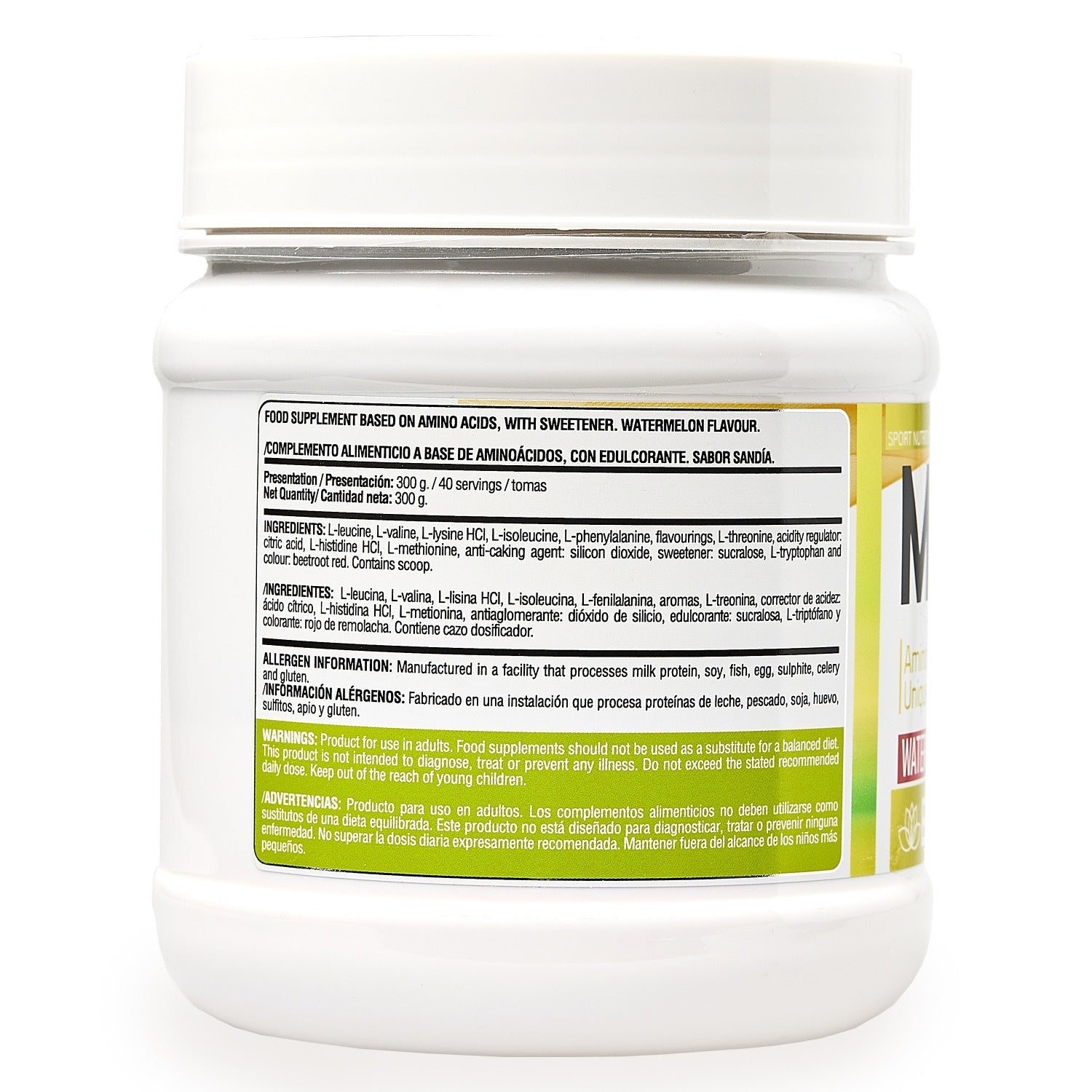 L-leucina, L-valina, L-lisina HCl, L-isoleucina, aromas, L-fenilalanina, L-treonina, L-histidina HCl, L-metionina, corrector de acidez: ácido cítrico (E-330), L-triptófano, edulcorante: sucralosa (E-955), sal y colorante: rojo de remolacha (E-162).