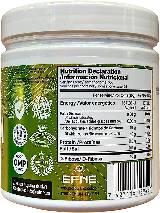 D-Ribosa EFNE se trata de un suplemento que se comercializa en formato en polvo de sabor neutro, la calidad es extrema, ya que no contiene agregados de ningún tipo, esta libre de dióxido de silicio del cual ya hay estudios que demuestran que este antiaglomerante puede afectar a intolerancias alimenticias, alergias y enfermedades autoinmunes.