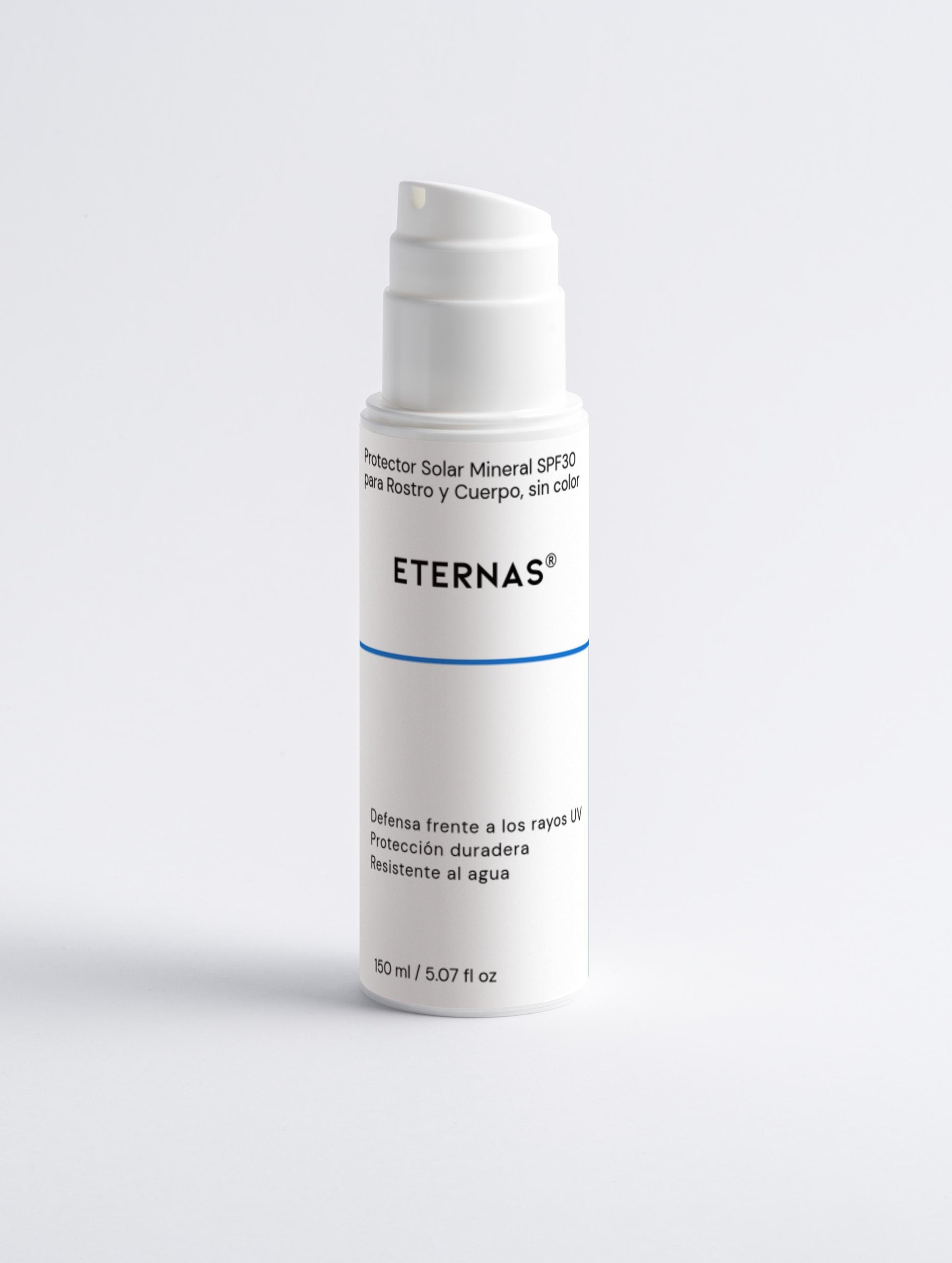 Protector solar mineral con SPF30 y protección UVA/UVB de amplio espectro desarrollado por Eternas. Enriquecido con ingredientes minerales que protegen y previenen el envejecimiento prematuro.